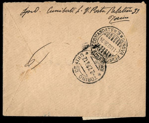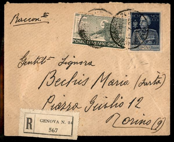 1 lira Giubileo (187e) non dentellato + 20 cent S. Francesco (192) su raccomandata da Genova a Torino del 1.7.26