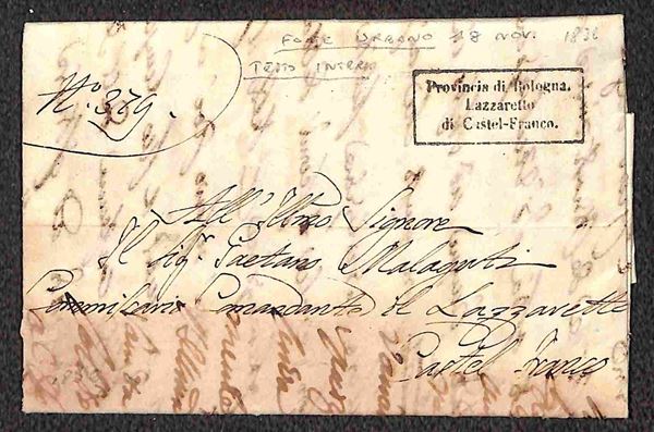 1836 - Pontificio - Provincia di Bologna / Lazzaretto / di Castel-Franco - lettera con elenco merci in contumacia da Forte Urbano del 18.11.1836 - interessante