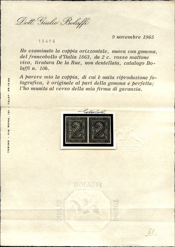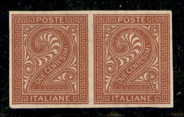 1863 - Coppia del 2 cent DLR (L15) non dentellata - gomma integra - Colla + Diena + cert. Bolaffi