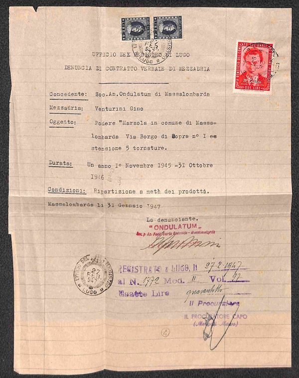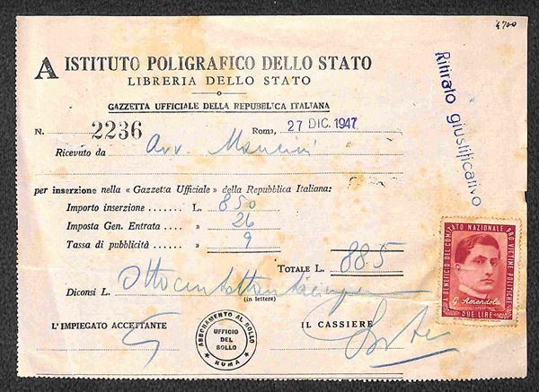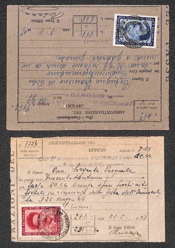 1945/1946 - Piccolo insieme di 1 busta e 4 ricevute con i valori del periodo (CEI 8/9) - merita esame