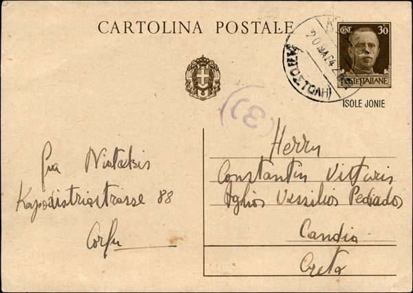 Cartolina Postale da 30 cent (C13) da Corfù a Candia del 20.3.42 con timbro di arrivo al retro
