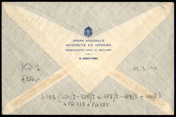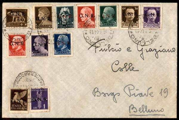 GNR Verona - Dodici valori (470/475 + 477/480 + Aerea 118 + 121) usati su busta - Belluno 16.3.1944