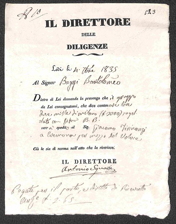 Il Direttore delle Diligenze - Lodi 4.9.35 - ricevuta di spedizione per gruppo di 2000 lire di Milano per Cremona