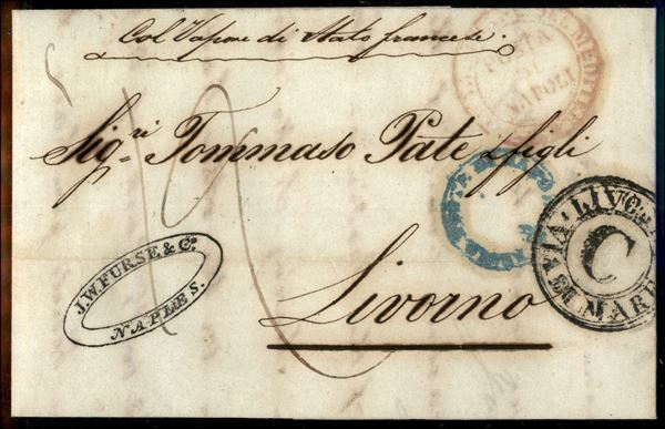 Regia Posta di Napoli (azzurro) + Posta di Napoli/Serv. Co. Vap. Franc. del Mediter. (rosso) + Livorno Via di Mare C - lettera del 28.5.1830