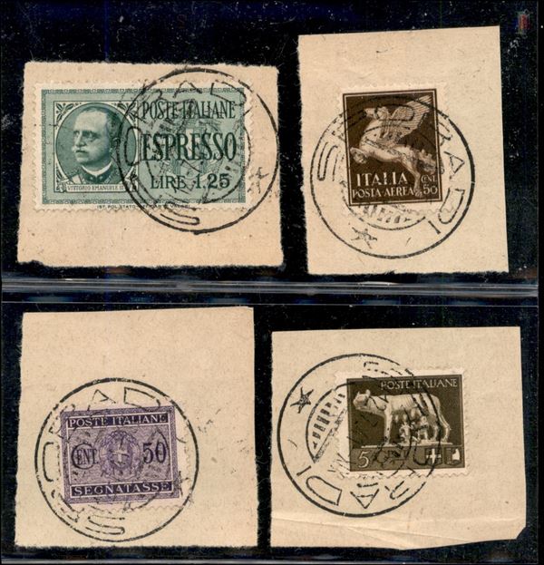 Sporadi - 12.7.41 - Quattro frammenti con valori di Regno usati nel penultimo giorno di apertura dell'Ufficio Postale