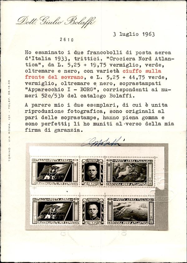 1933 - Trittici I-BORG (51Da + 52D) - serie completa con varietà "Ciuffo" angolo di foglio e bordo foglio per l'altro valore - gomma integra - splendidi - cert. G. Bolaffi