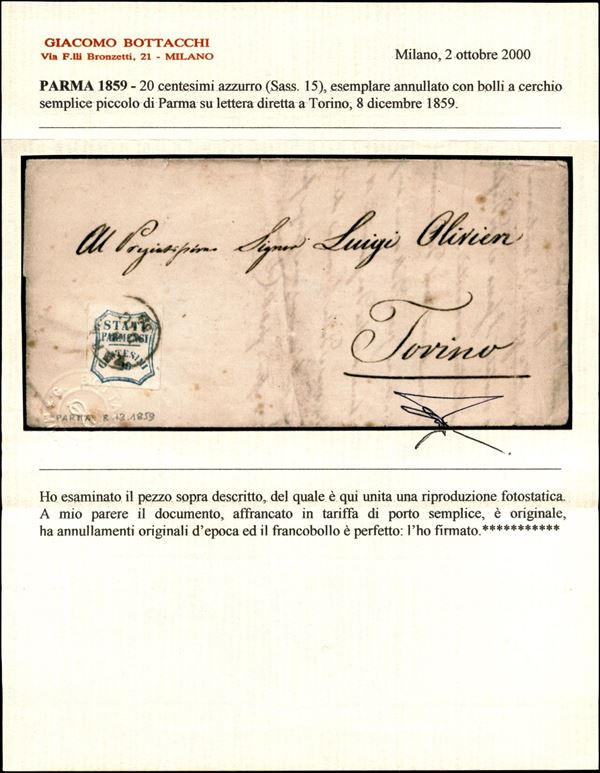 20 cent (15) su lettera da Parma a Torino del 8.12.59 - cert. Bottacchi (3.000)