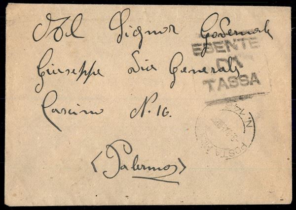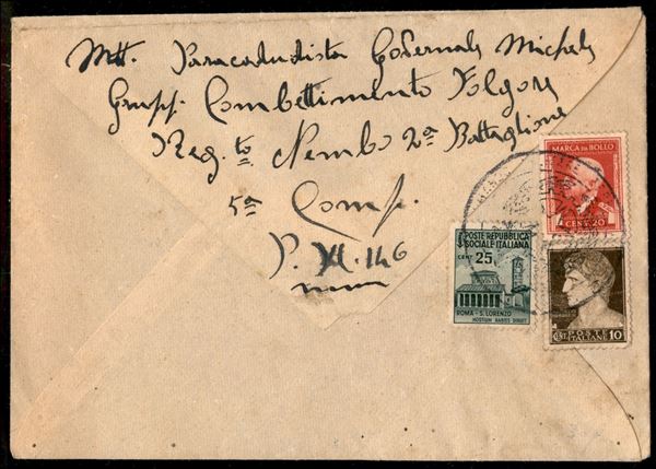 Busta dalla Posta Militare N. 146 a Palermo del 9.3.1945 Esente da Tassa - affrancata al retro (495 + 505 + Marca da Bollo 22) con valori di recupero annullati con timbro amministrativo