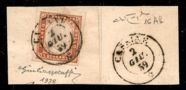 Cassine (P.ti 6) - 40 cent vermiglio arancio chiaro (16Ab) usato su frammento - G. Bolaffi + M. Raybaudi