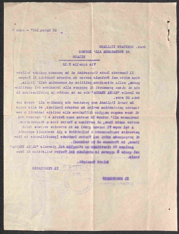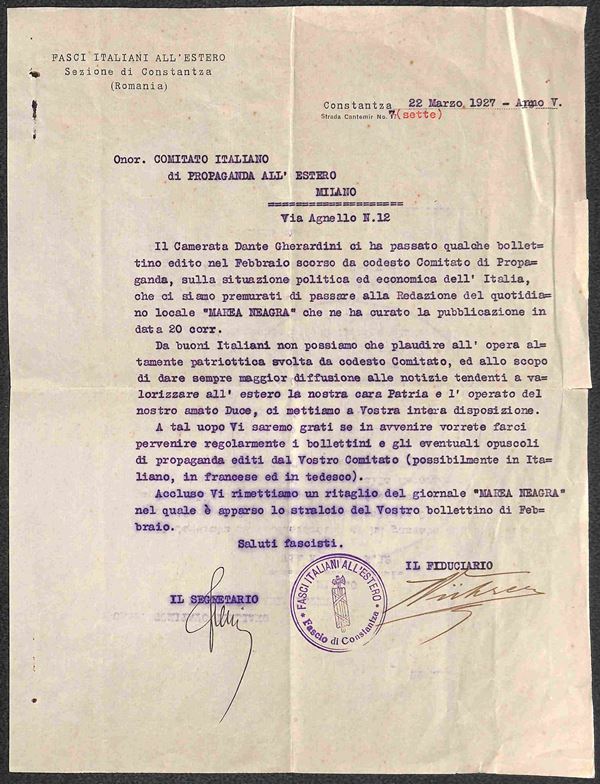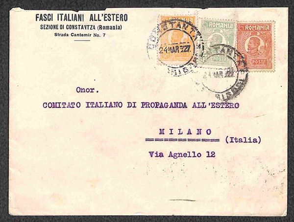 Ferdinando I (270II+274II+280I) - busta "Fasci Italiani all'Estero" da Costanza a Milano del 24.3.27 - contenuto interessante