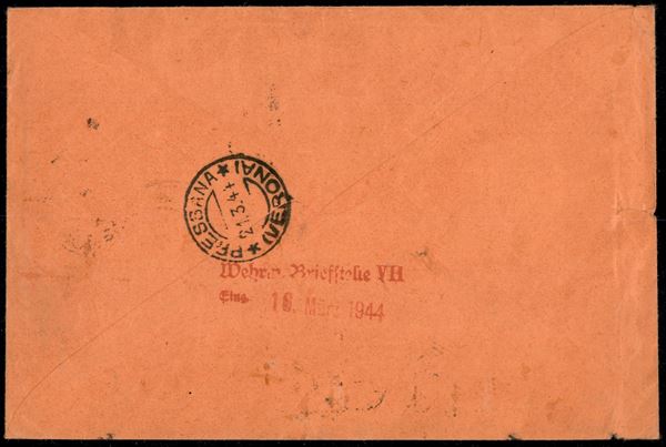 Raccomandata da Pressana al Comando del 20° Distretto del 17° Reg./P.C. 759 del 11.3.1944 con affrancatura multipla Imperiale (245 due + 246 tre + 247) resa al mittente percheč priva del corrispondente numero di Feldpost