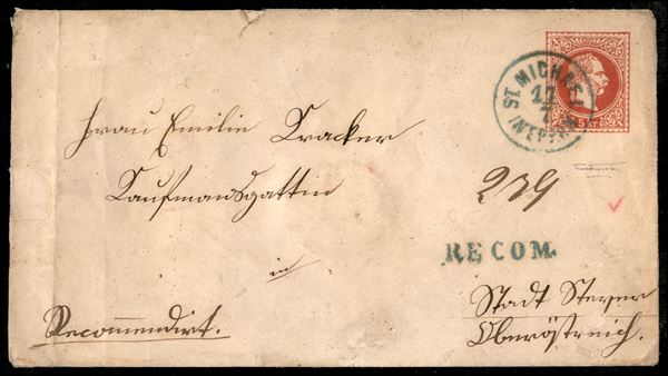 Recom di St. Michael in Eppan (azzurro - P.ti 6) - busta postale da 5 kreuzer per Steyr del 17.7.70 con complementare (35) al retro