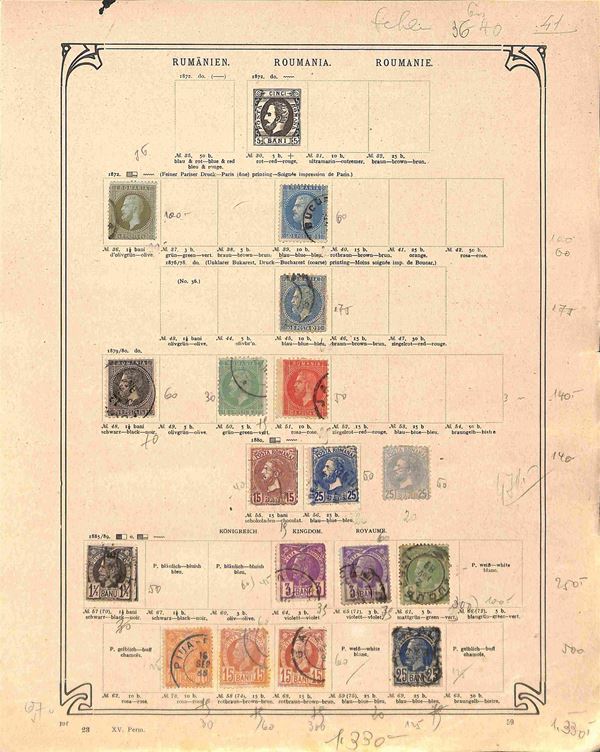 ROMANIA - 1872/1911 - Piccola collezione di circa 110 valori del periodo montati su 7 fogli d'album d'epoca - principalmente usati - da esaminare