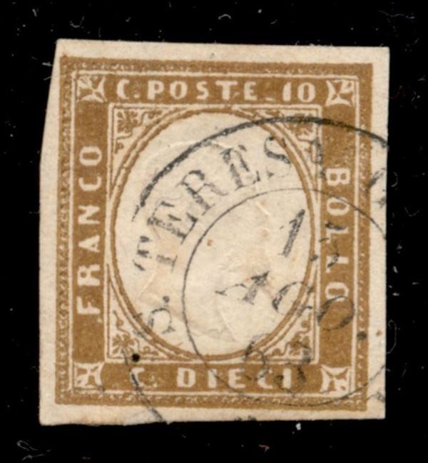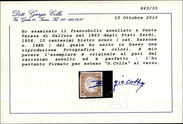 S. Teresa di Gallura (R2) - 10 cent bistro scuro (14Eb) usato il 15.8.1863 - insieme estremamente raro - cert. G. Colla