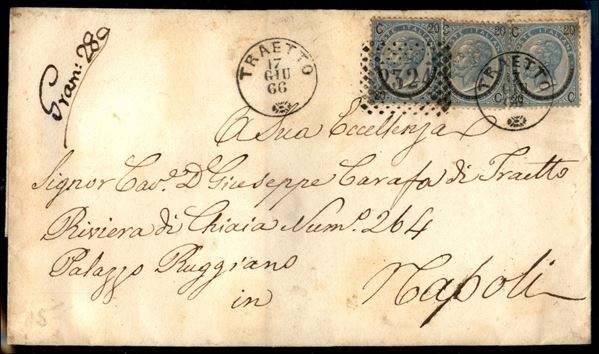 Traetto + 2324 a punti - tre 20 cent su 15 (25) su lettera per Napoli del 17.6.1866