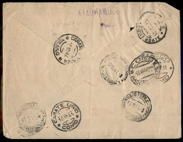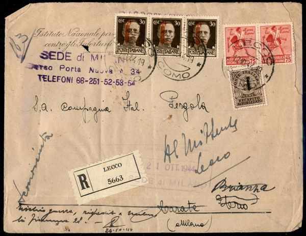 Tre 30 cent (493E) con fascio arancio + coppia del 75 cent Tamburino (499) + 10 cent Recapito (4) - raccomandata da Lecco a Carate del 12.10.1944 con inoltri diversi e reso a Lecco poi rispedita a Milano per rischio guerra (21 ottobre)