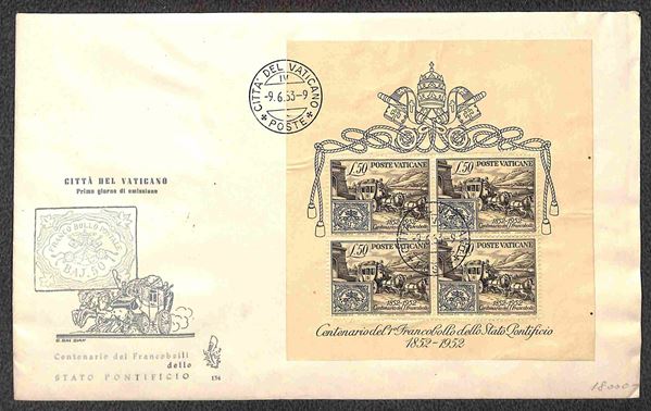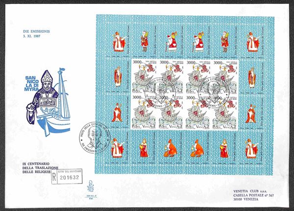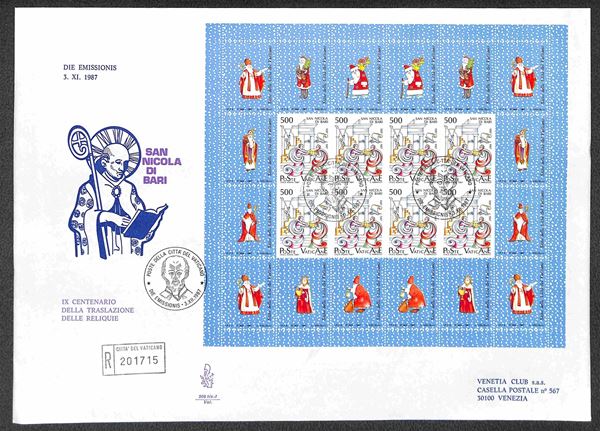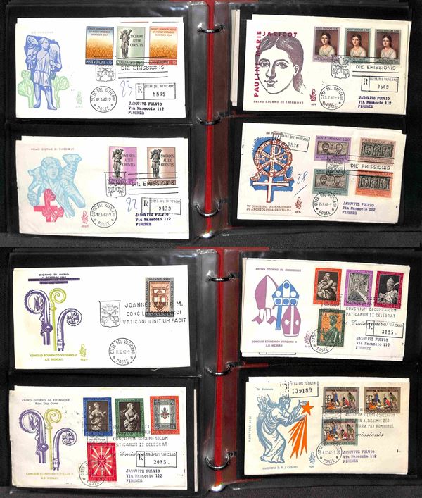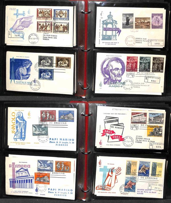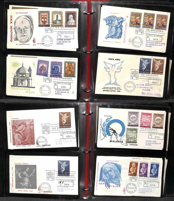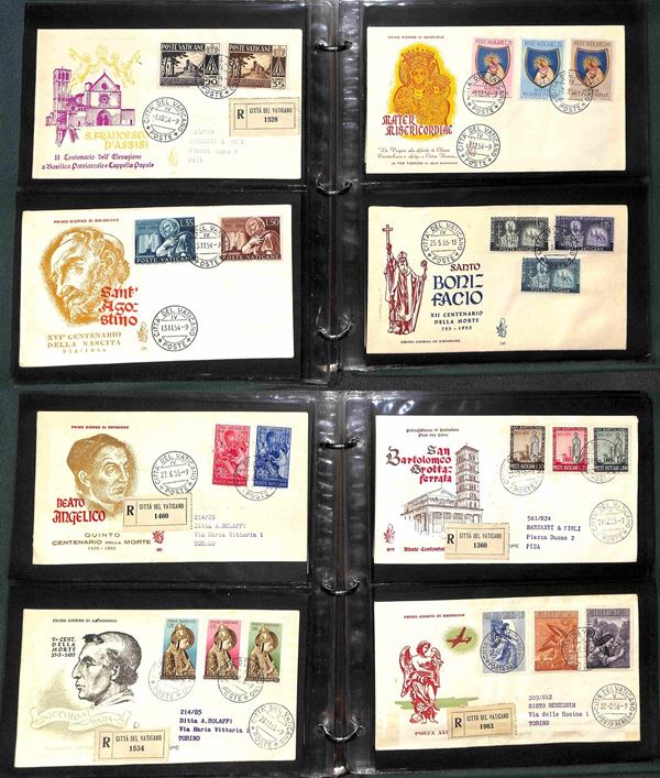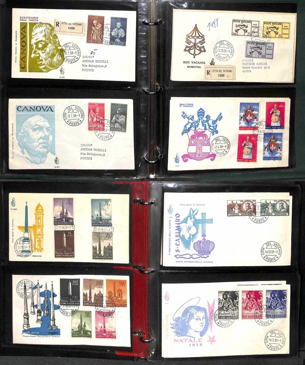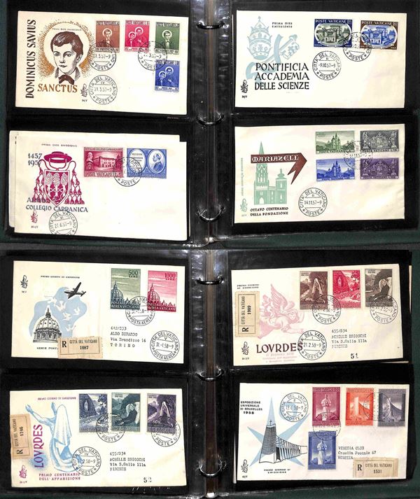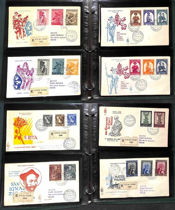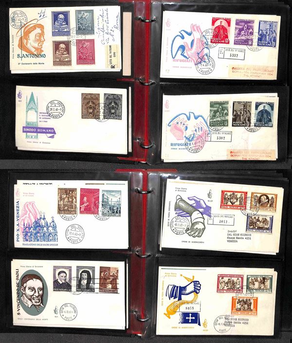 VATICANO - 1952/1991 - Collezione pressochè completa (mancanze 52/54) di FDC Venetia Club emessi nel periodo con doppioni di altre emissioni - notati bustoni dei foglietti S. Nicola e altre buone presenze - tutto montato in 8 album raccoglitori + 1 album portafogli - valore di catalogo 1300 €