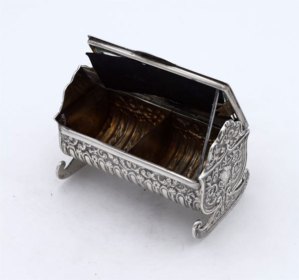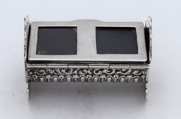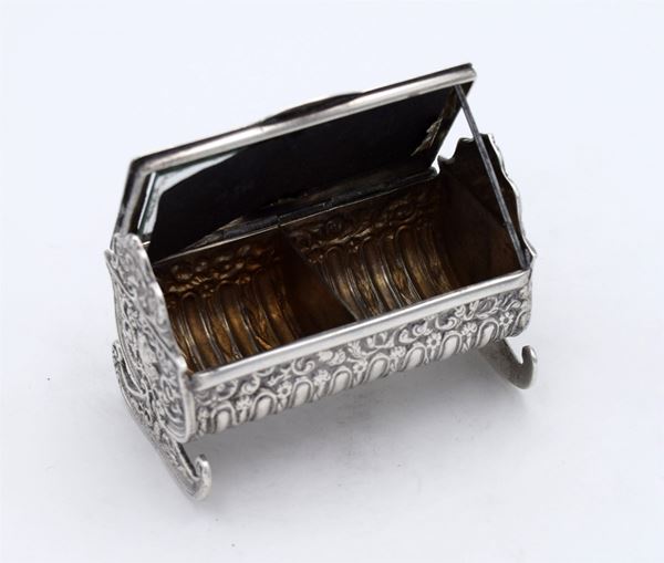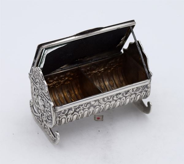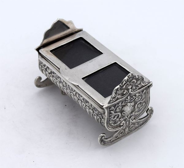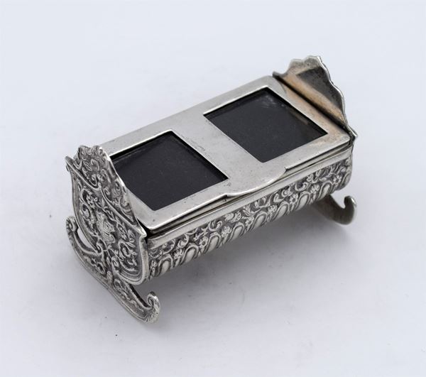 1896 - Birmingham - Meravigliosa scatola modellata a forma di culla con coperchio a molla con 2 finestre (vetro) - completamente lavorata su tutti i lati - interno con 2 spazi concavi - bellissima e raro esempio di design dell'epoca