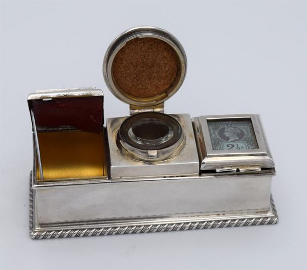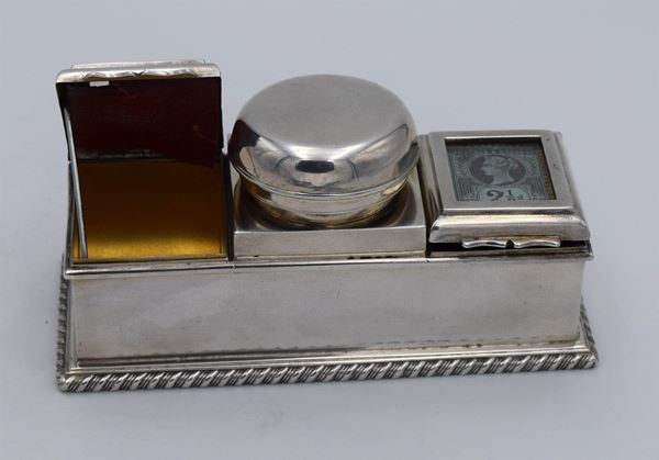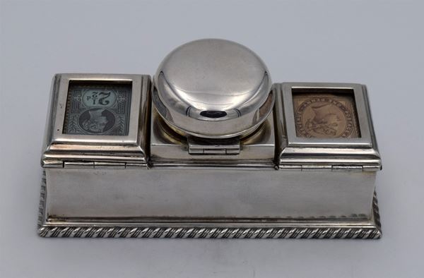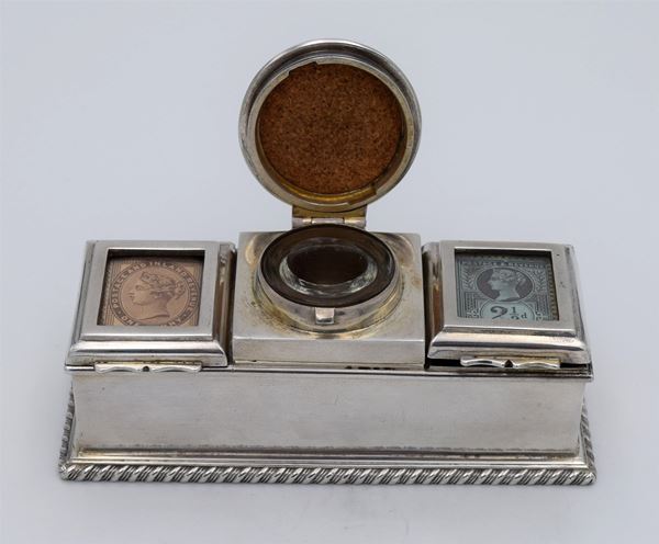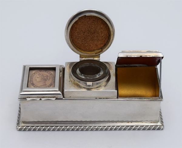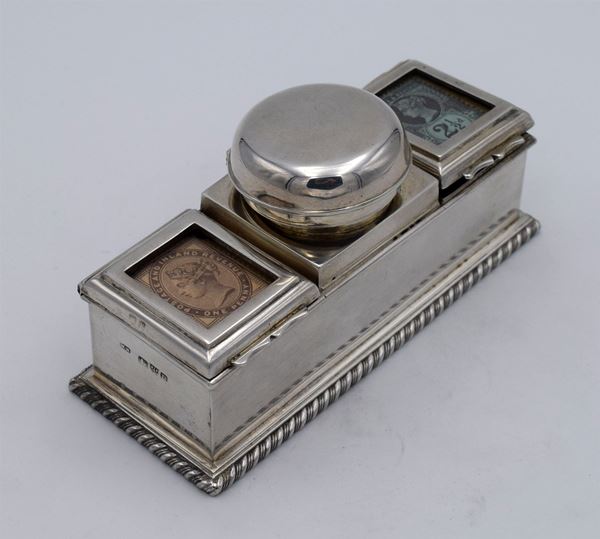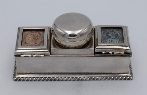 1900 - Chester - Scatola rettangolare con basamento a sbalzo lavorato - scomparto centrale per inchiostro con coperchio tondo cerneriato e 2 scomparti porta francobollo laterali con finestra (vetro) - interno con 2 spazi concavi dorati - molto bella