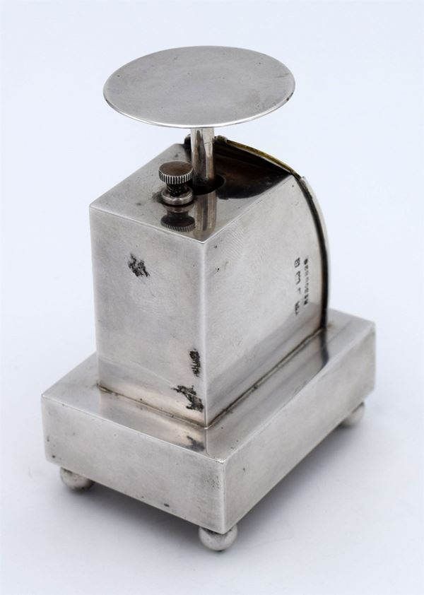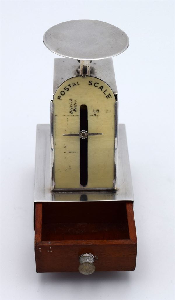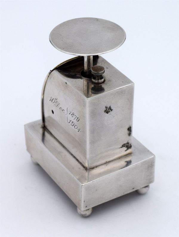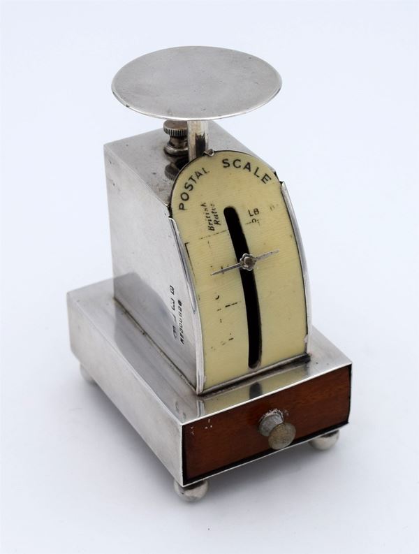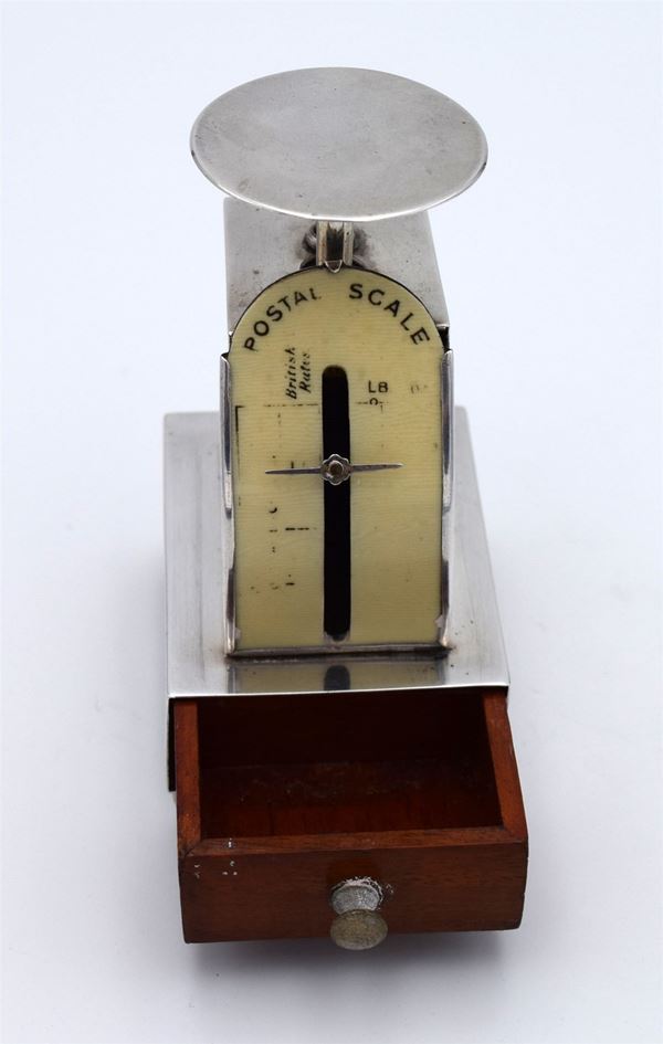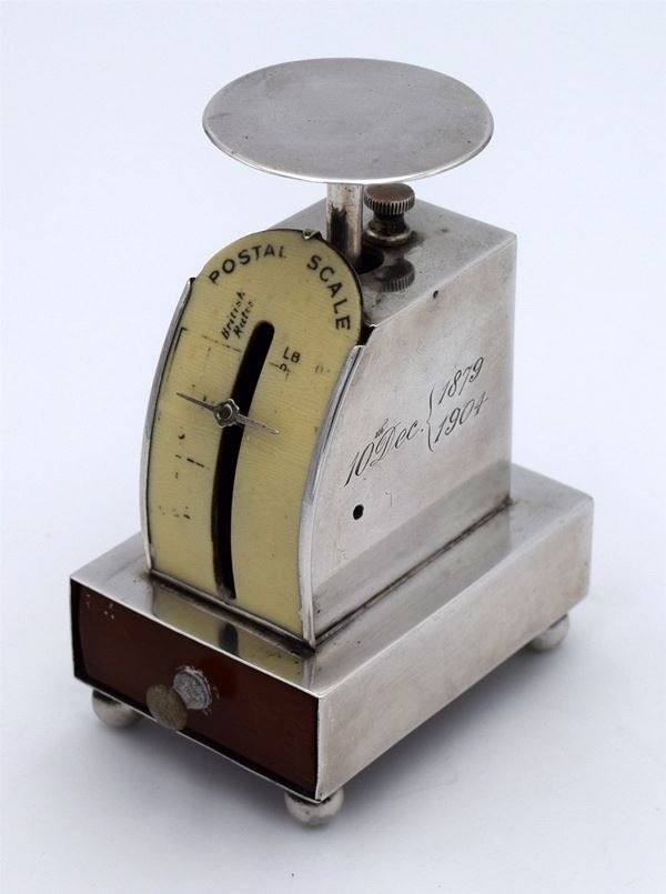 1900 - London - Bilancia postale con pannello regolatore in avorio montata su base rettangolare con cassettino in legno con 2 spazi porta francobolli in legno su 4 piedini a palla - piattino circolare - incisione sul lato destro "10 Dec 1879/1904" - molto bella