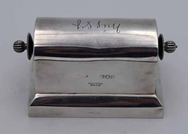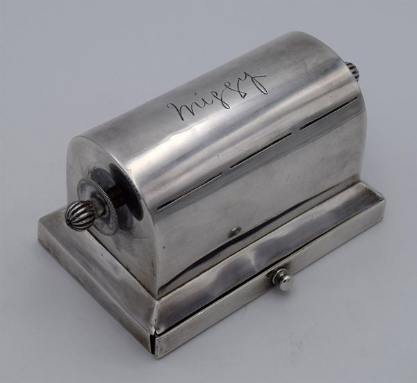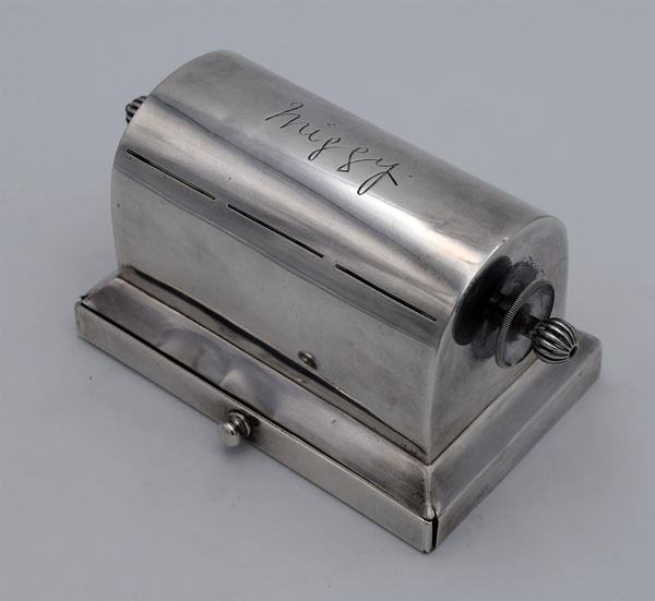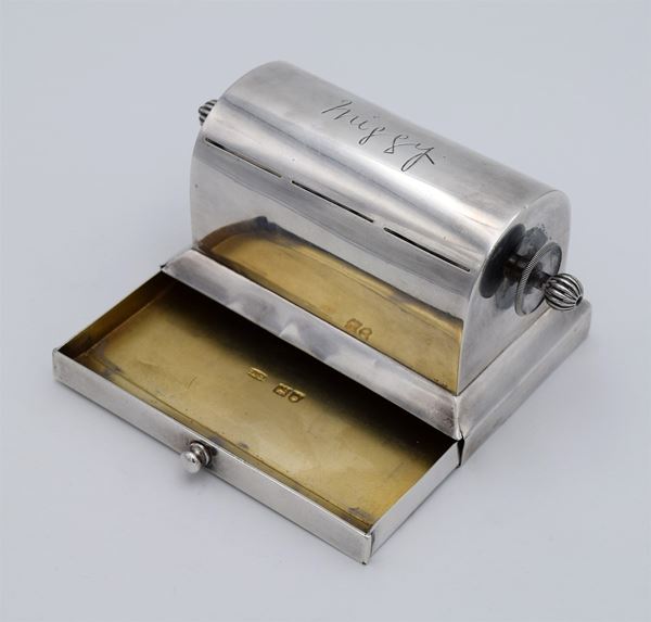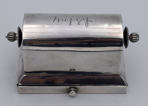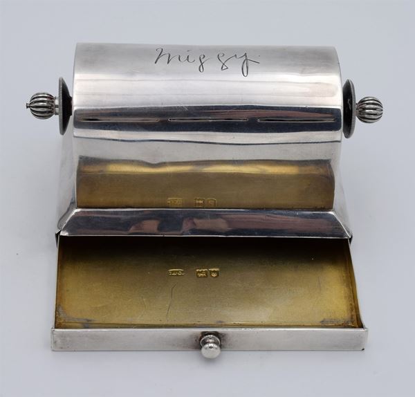 1901 - London - Splendido distributore di francobolli a bobina marcato "Asprey & Sons Bond St.W" e "PATENT" pił incisione "Miggy" con 3 fessure sul fronte e 2 maniglie a pomello laterali con 2 cursori a disco - cassetto centrale con pannello e interno dorato - bellissima
