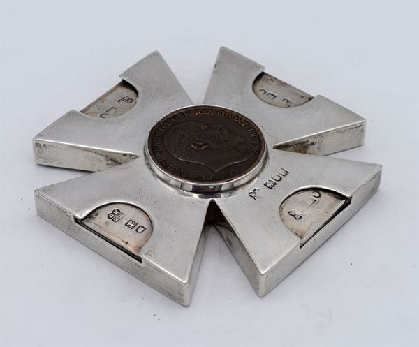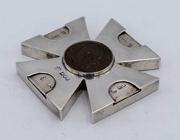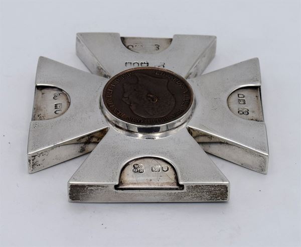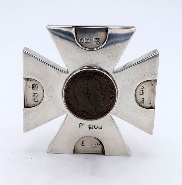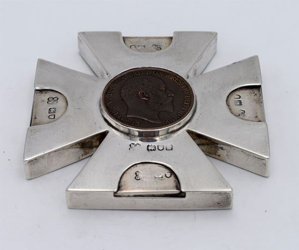 1902 - London - Bellissima scatola modellata a forma di Croce di Malta con i 4 lati intagliati per altrettanti distributori a molla di francobolli - al centro incastonata una medaglia con effige del Re e dicitura - molto bella