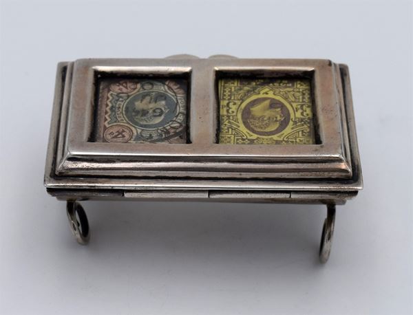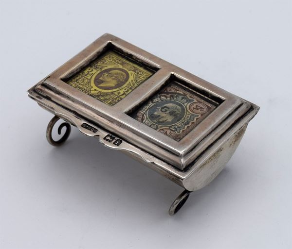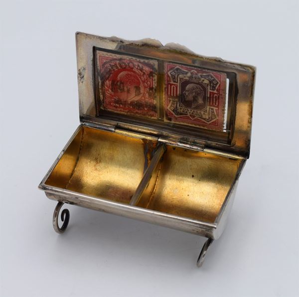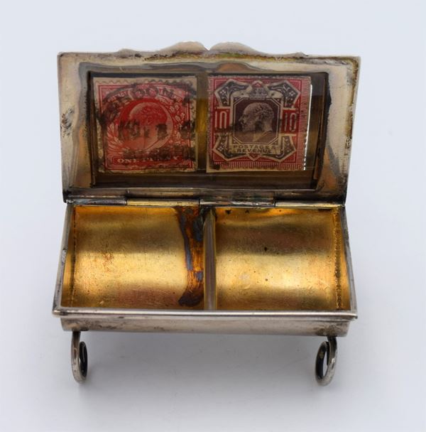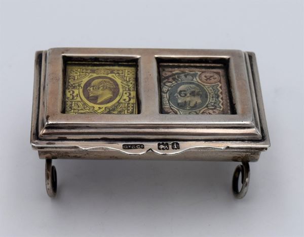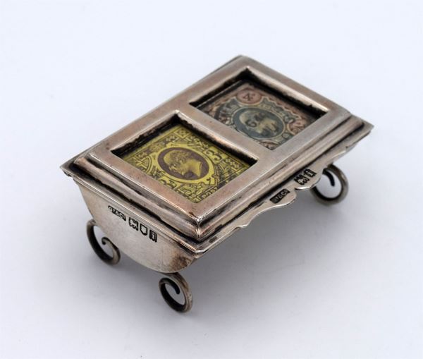 1904 - London - Scatola con doppio compartimento a finestra con vetro e base con 2 piedini a filo intrecciato - coperchio con apertura agevolata da lavorazione a baffo con all'interno 2 spazi concavi dorati - molto bella e insolita
