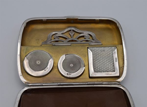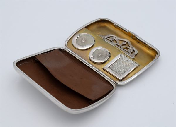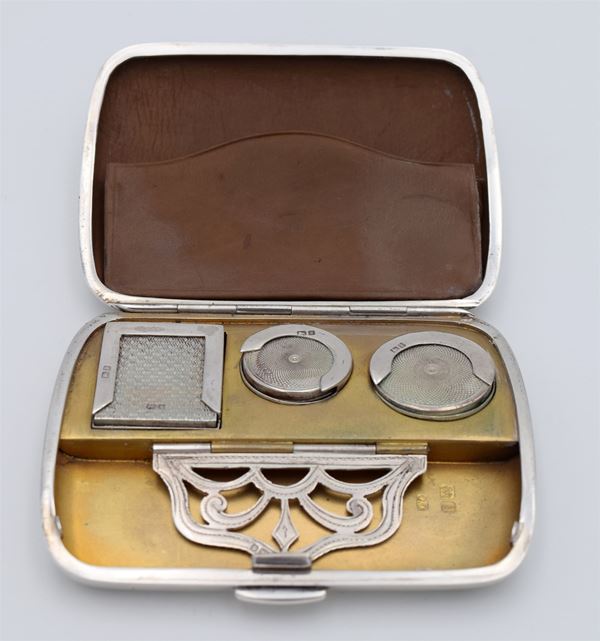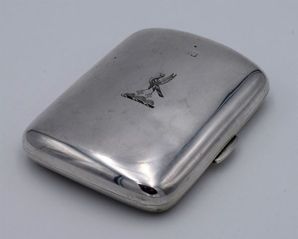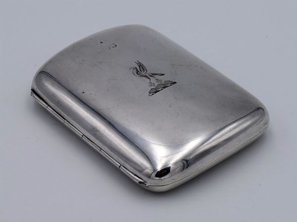 1905 - Chester - Astuccio da tasca leggermente curvo che si apre su interni dorati - un lato con distributore di francobolli mezze sterline e sterline oltre a fermaglio a molla mentre sul lato opposto scomparto in pelle per biglietti da visita - sul fronte un incisione di una fenice che tiene due croci - insolito