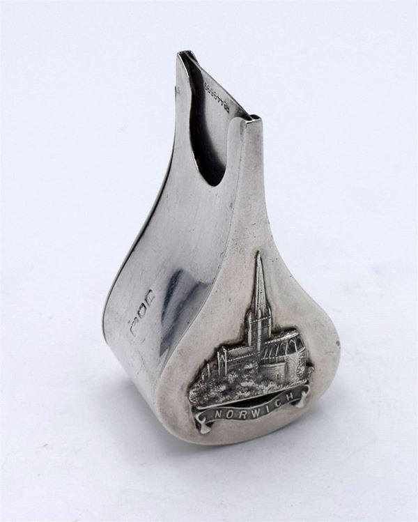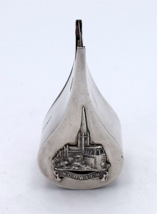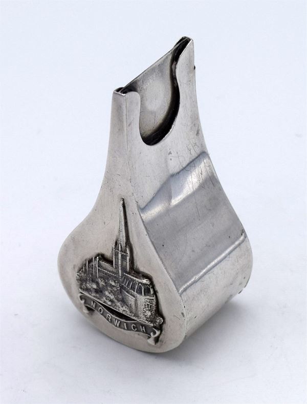 1905 - London - Dispensa per bobine a forma di goccia con all'interno 2 spazi divisi - apertura a cerniera laterale - incisione figurata su un lato della chiesa di "Norwich" - insolita