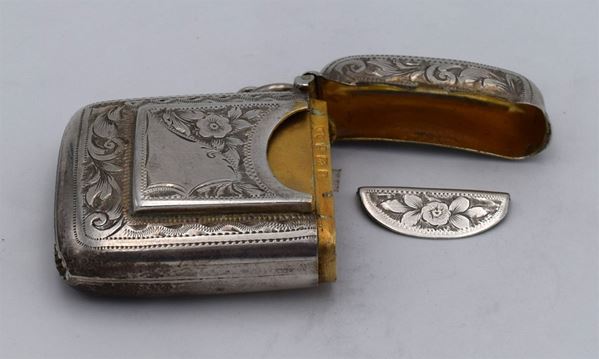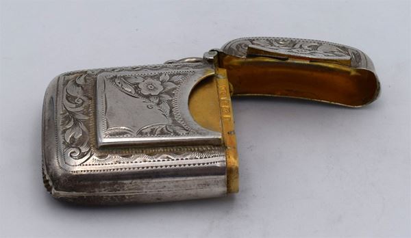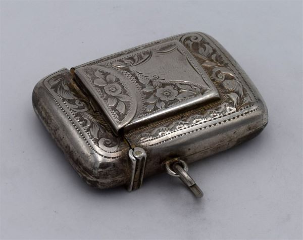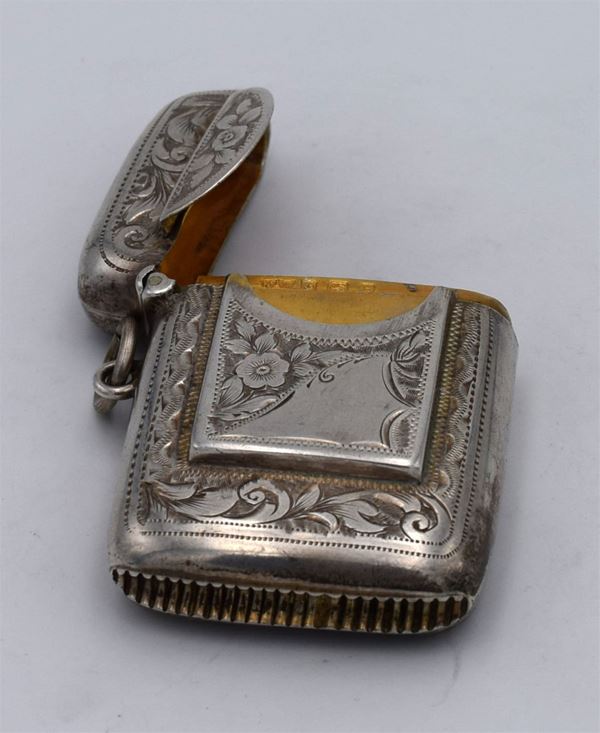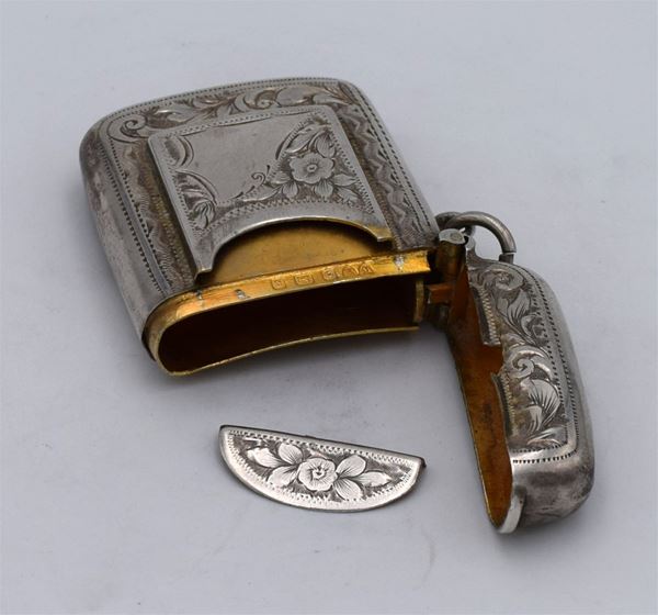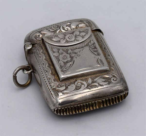 1906 - Birmingham - Piccola scatola incisa con motivi floreali fronte retro e sul fondo lavorazione seghettata - sul fronte tasca porta francobolli e 1 spazio per fiammiferi - doppio coperchio (difettoso) a molla con interno dorato - insolita