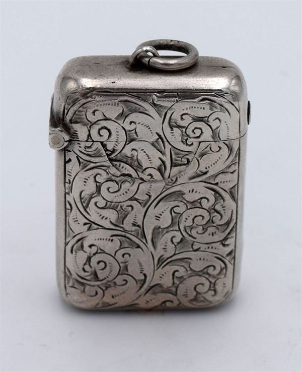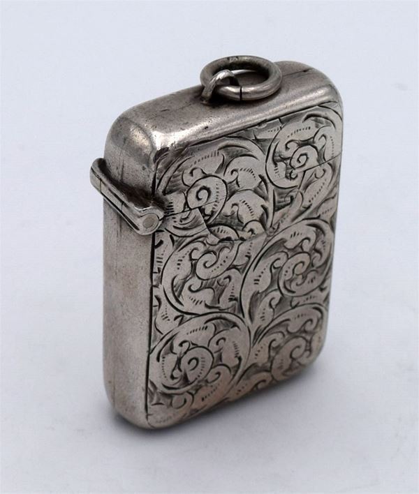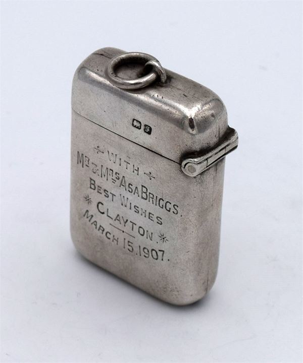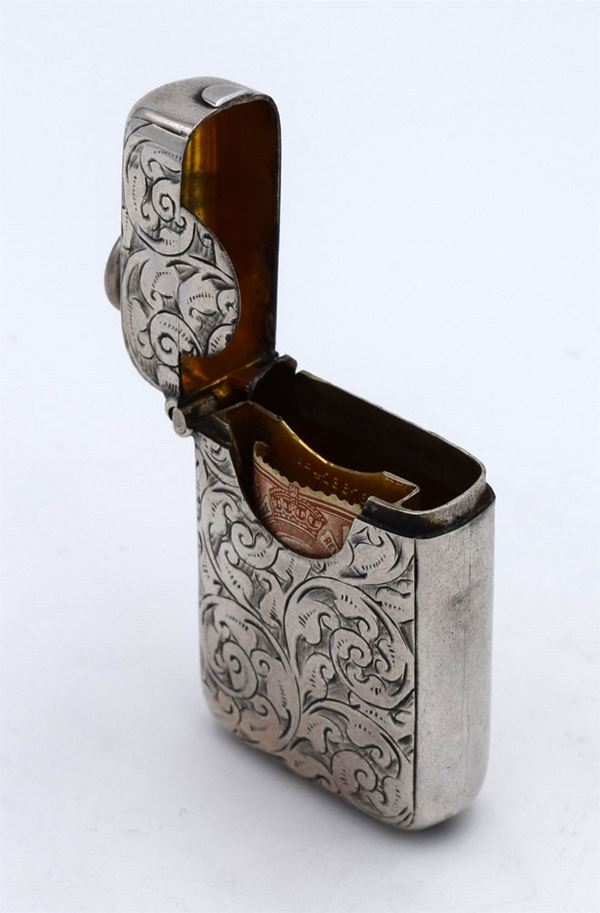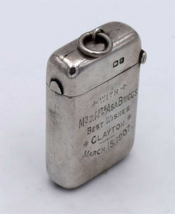1906 - Chester - Bellissimo porta francobolli e fiammiferi tascabile con incisione frontale tipo floreale - coperchio a molla con interno dorato e 2 spazi - fondo seghettato - inciso "With Mr & Mrs Asa Briggs Best Wishes Clayton March 15.1907" - raro e insolito