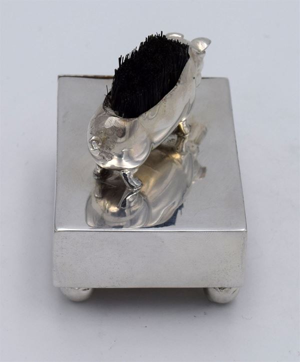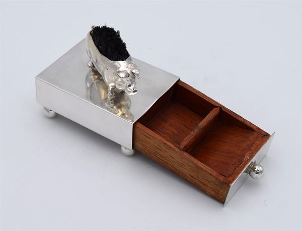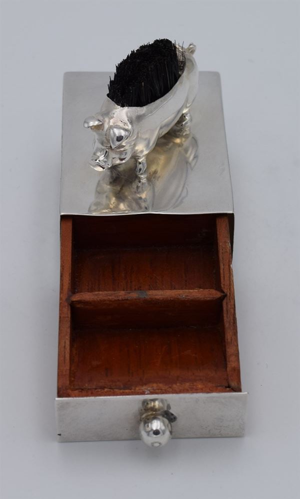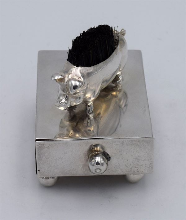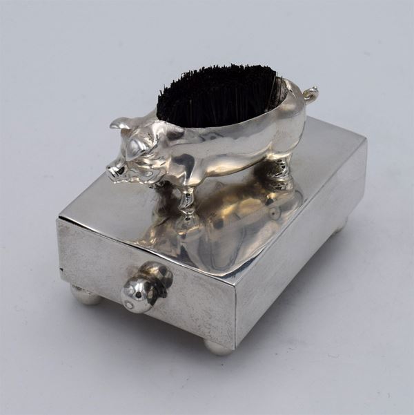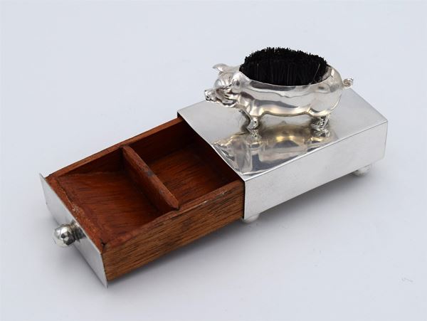 1908 - Birmingham - Scatola rettangolare con piccolo maiale con spazzola di setole sulla schiena e cassetto in legno (frontale con pomello in argento) con all'interno 2 spazi di cui uno a scivolo - 4 piedini a forma di palla - bella e inusuale