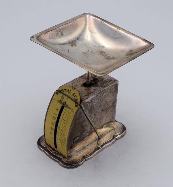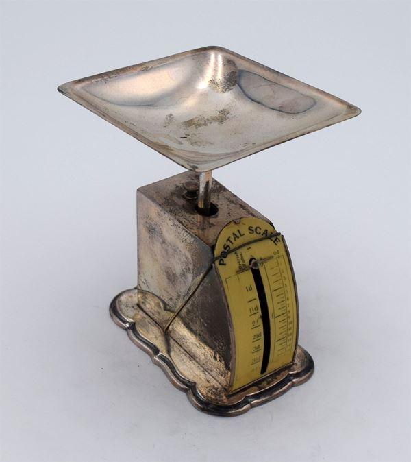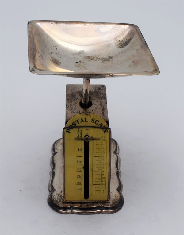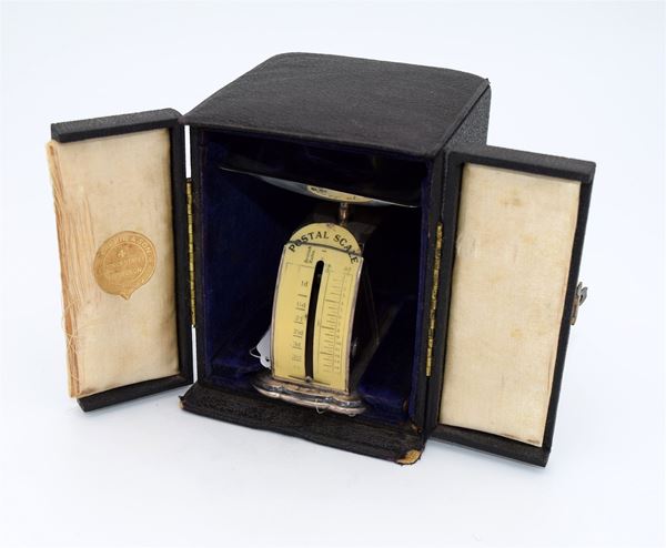 1908/1909 - Birmingham - Splendida bilancia postale nella scatola originale d'epoca della ditta "A. Barrie & Son - 4 George Street Edinburgh" - frontale in avorio con scala di valori e piatto di pesa quadrato - molto bella