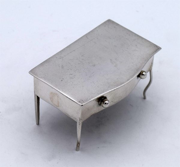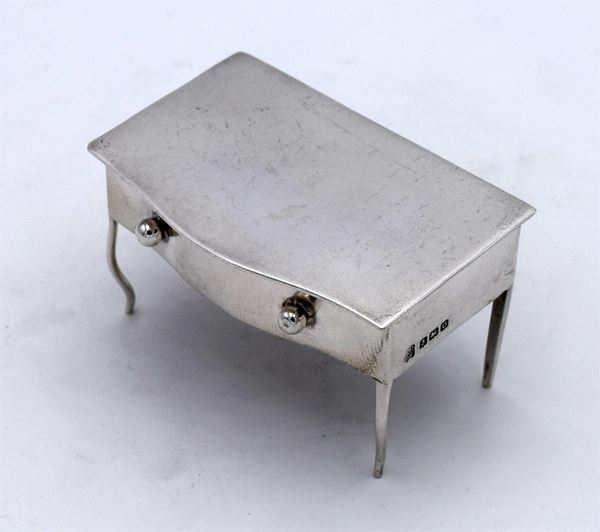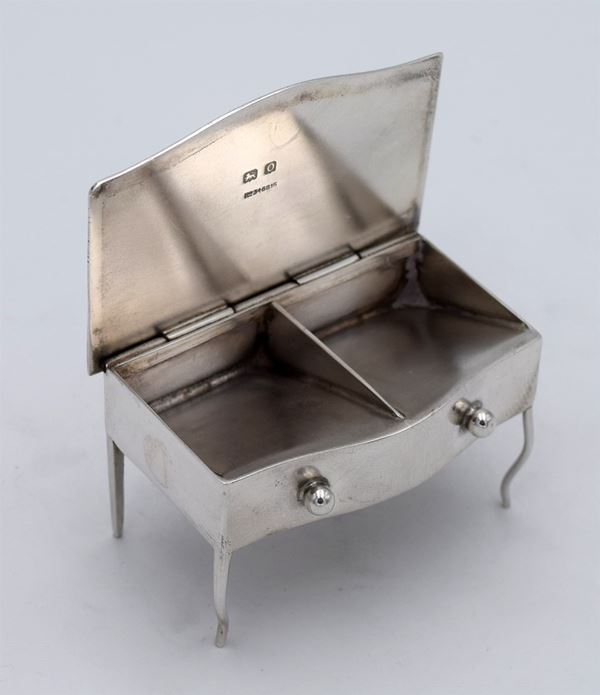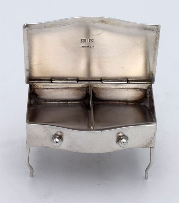 1913 - Birmingham - Scatola modellata a forma di mobiletto con finto cassetto con pomelli piccoli a forma di palla e 4 gambe lunghe (due lavorate) - coperchio con apertura a cerniera e all'interno 2 spazi concavi - molto bella