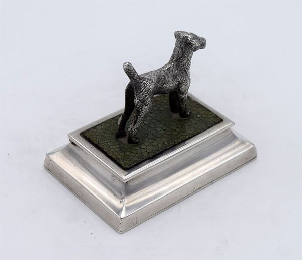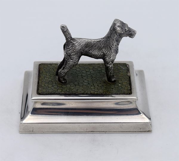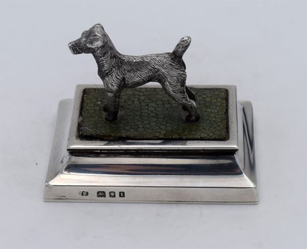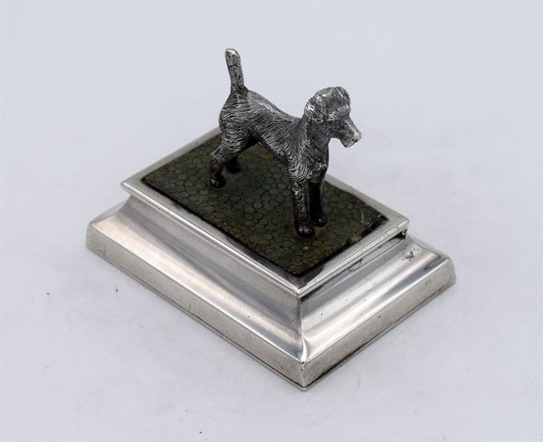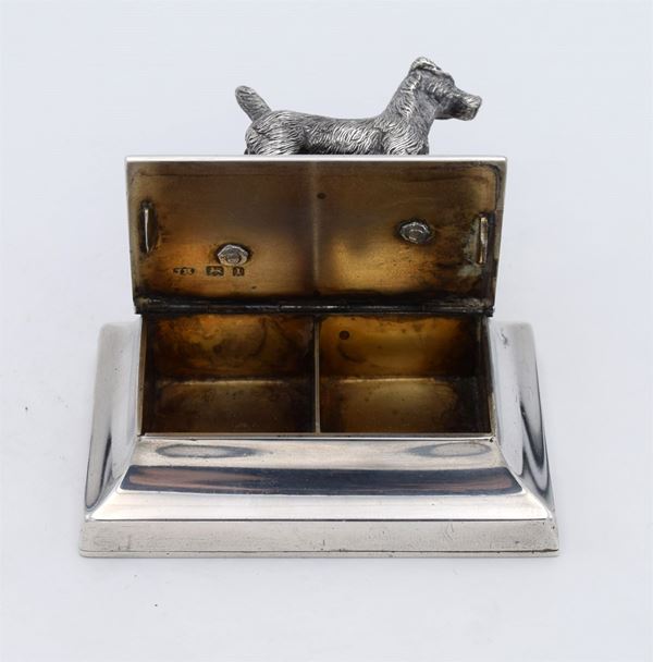 1926 - London - Bellissima scatola sormontata da riproduzione di cane che poggia su finto prato in pelle con apertura a cerniera - all'interno 2 spazi concavi - molto bella
