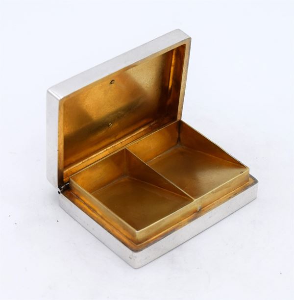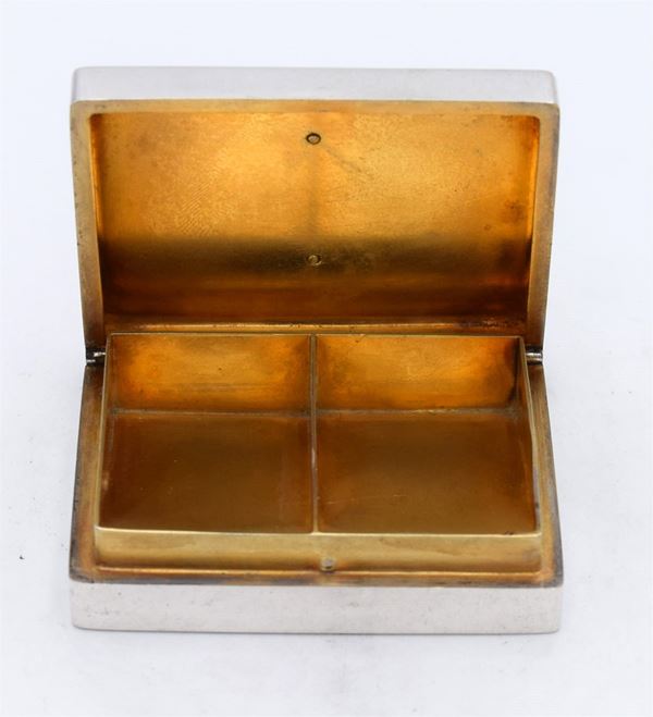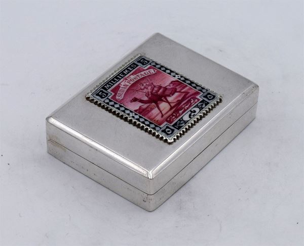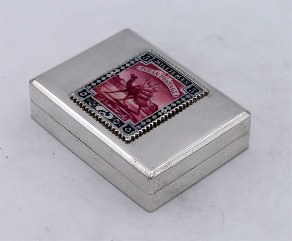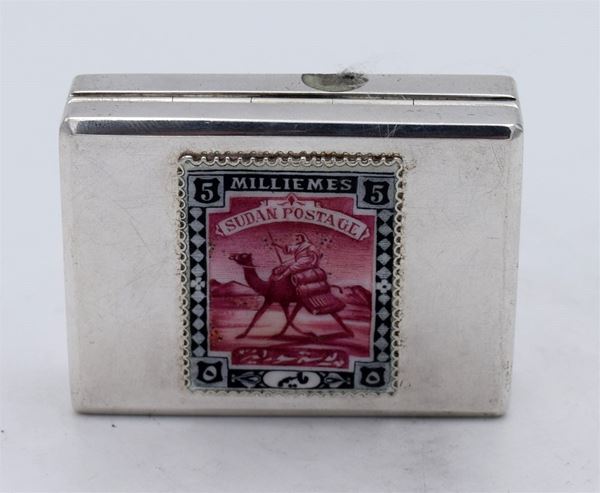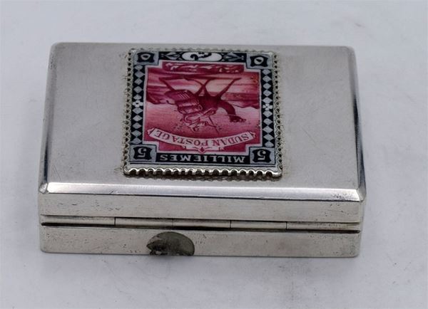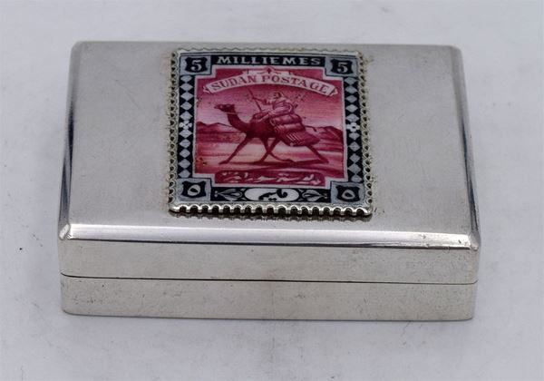 Scatola rettangolare con riproduzione di francobollo "15 milliemes SUDAN" smaltata - apertura a cerniera con interno dorato e 2 spazi a scivolo - due piccole ammaccature sul fondo - molto bella