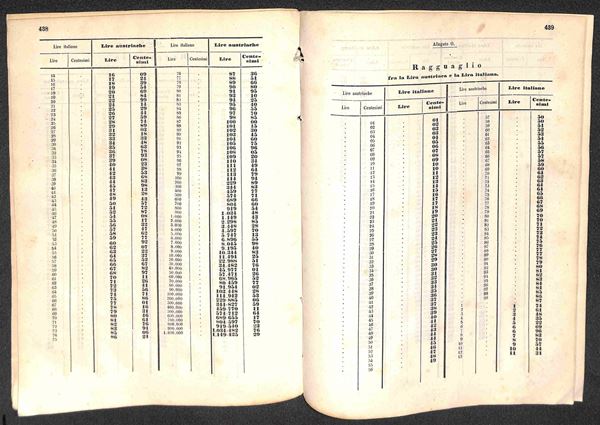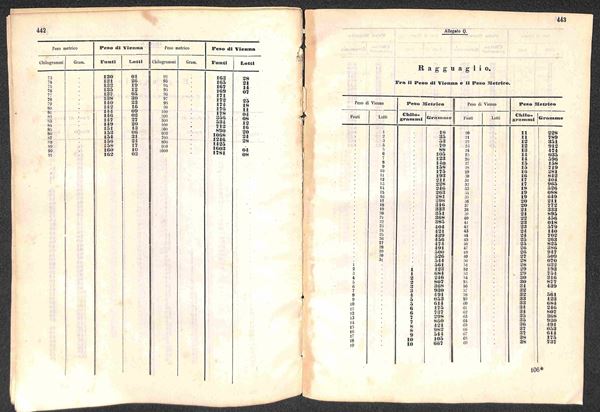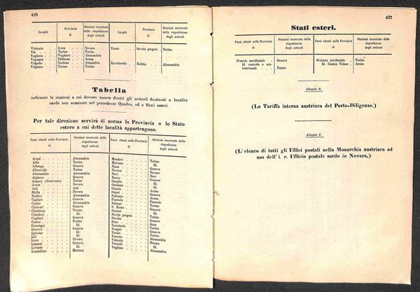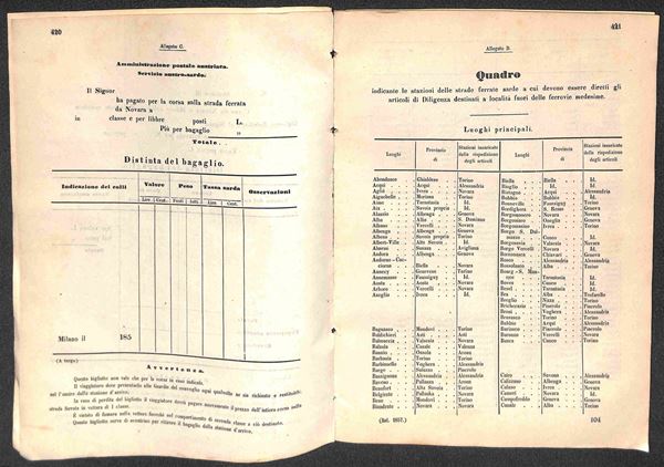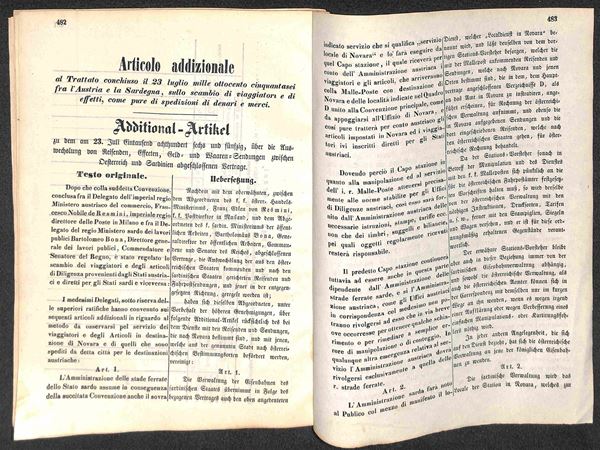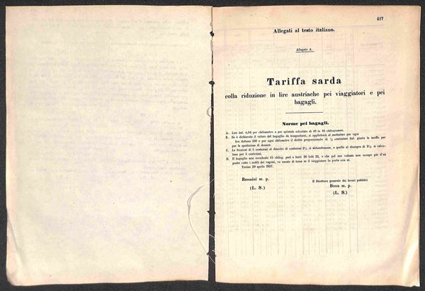 1856 - Strade Ferrate - Allegati al testo italiano del Trattato tra Austria e Sardegna con tariffe per trasporto passeggeri e merci - pag. 415/448 + 481/484