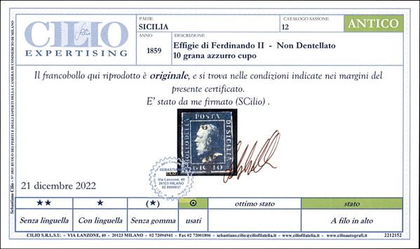 1859 - 10 grana azzurro cupo (12) - usato - margine alto a filo