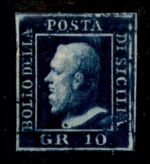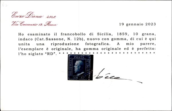 1859 - 10 grana indaco (12b) - gomma originale con forte linguella al retro - cert. R. Diena