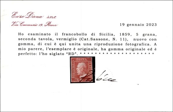 1859 - 5 grana (11) seconda Tavola - gomma originale - cert. R. Diena