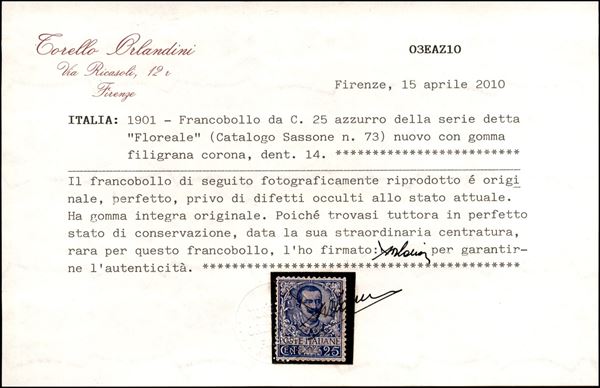 1901 - 25 cent Floreale (73) - gomma integra - ottimamente centrato - dentellatura carente a destra in alto - cert. Orlandini