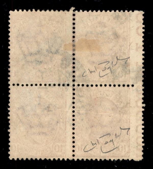 1906 - 10 cent Leoni (82) - quartina usata - dentellatura verticale sinistra spostata sulle diciture di bordo (salto di dentellatura - formati diversi) - Raybaudi