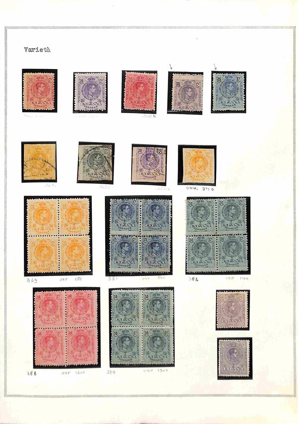 1909/1922 - Alfonso XIII - Foglio d'album con 8 valori singoli e 5 quartine nuovi + 3 valori usati (233/245) con interessanti varietà di stampa e dentellatura