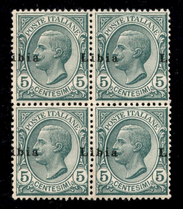 1912 - 5 cent Leoni (3p) in quartina - soprastampa spostata (ibia L) - gomma integra