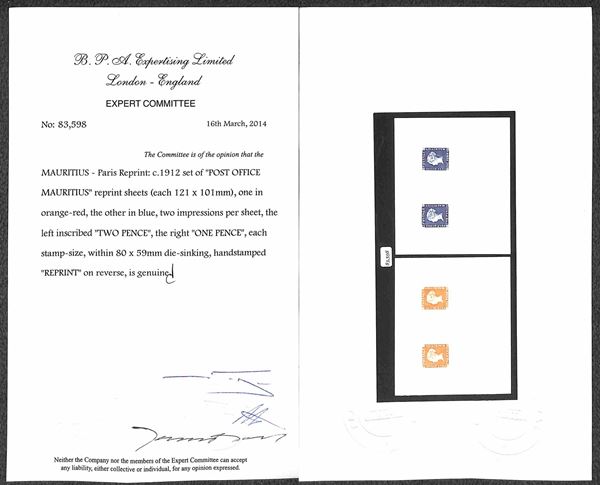1912 - Due foglietti delle ristampe dei francobolli da 1 e 2 pence - senza gomma - cert. B.P.A.
