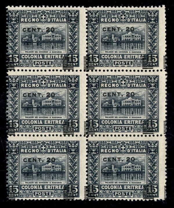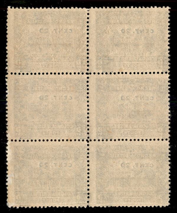 1916 - Blocco di sei del 20 su 15 cent (46 tipo c) con soprastampa spostata a sinistra - gomma integra
