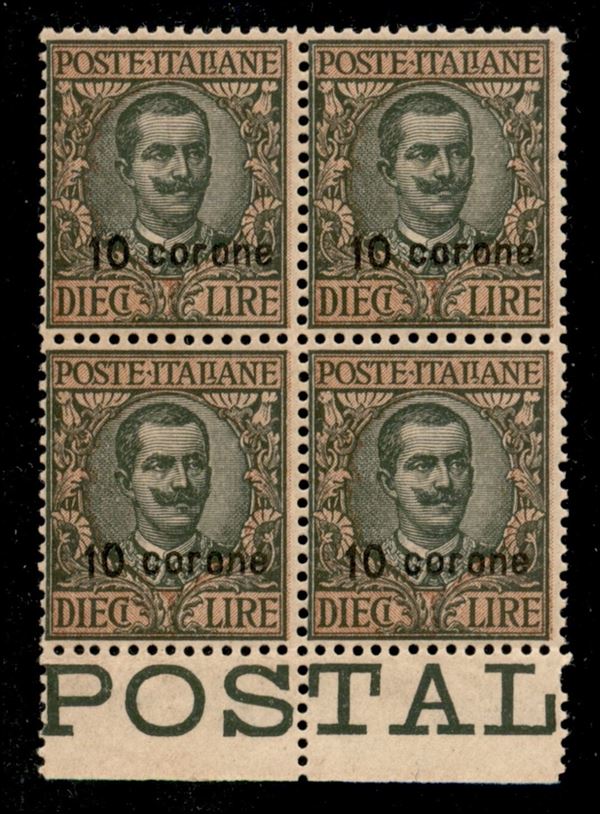1921 - 10 corone su 10 lire (8) - quartina bordo foglio - gomma integra