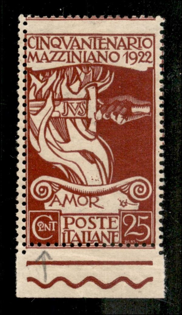 1922 - Mazzini 25 cent con E di cent deformata e con doppia dentellatura verticale a sinistra (128f-128g) - fresco - gomma originale