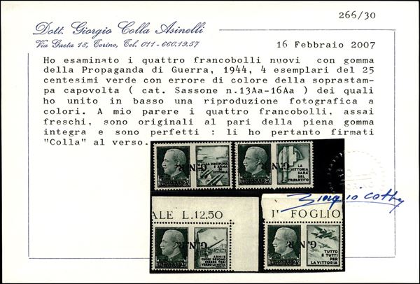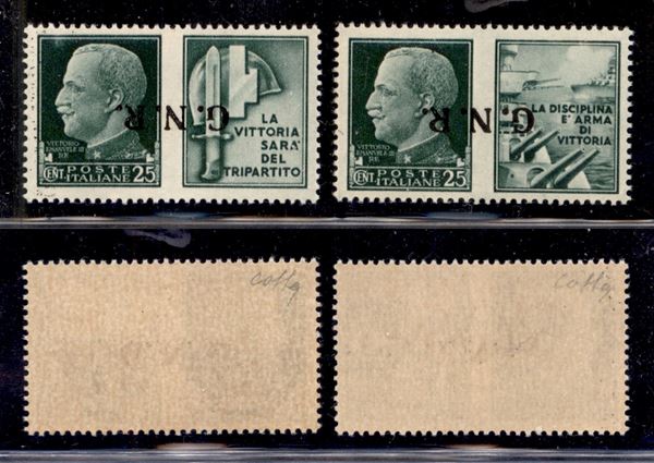 1944 - Errori di Colore - Propaganda (Marina/Milizia) - 25 cent (13Aa/16Aa) con soprastampe capovolte - gomma integra - cert. Colla + cert. AG