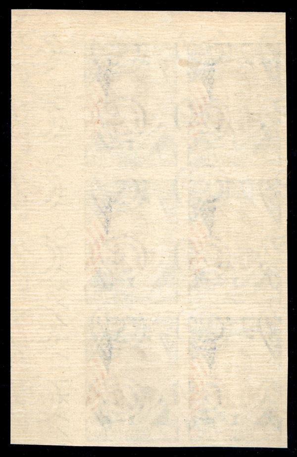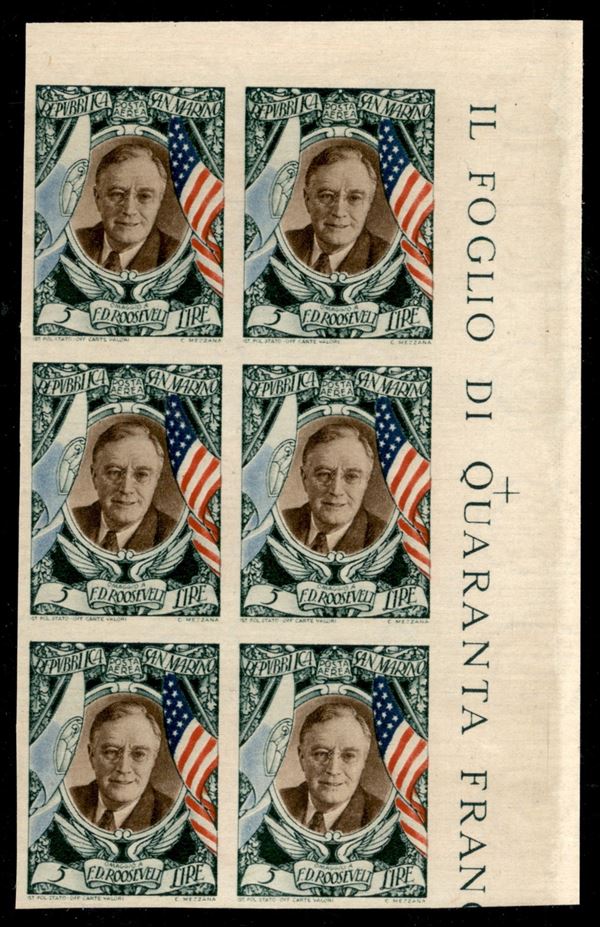 1947 - 5 lire Roosevelt (303b) non dentellato - blocco angolare di 6 - gomma integra